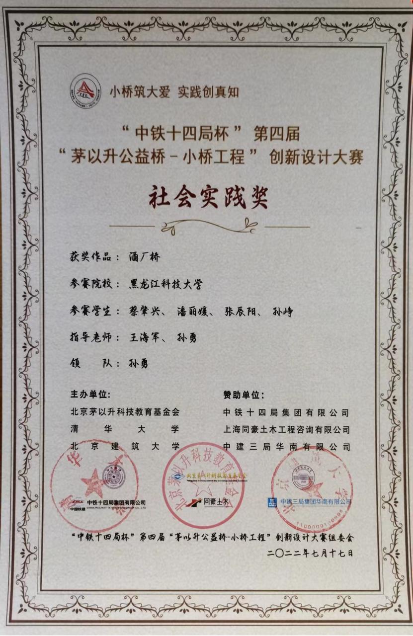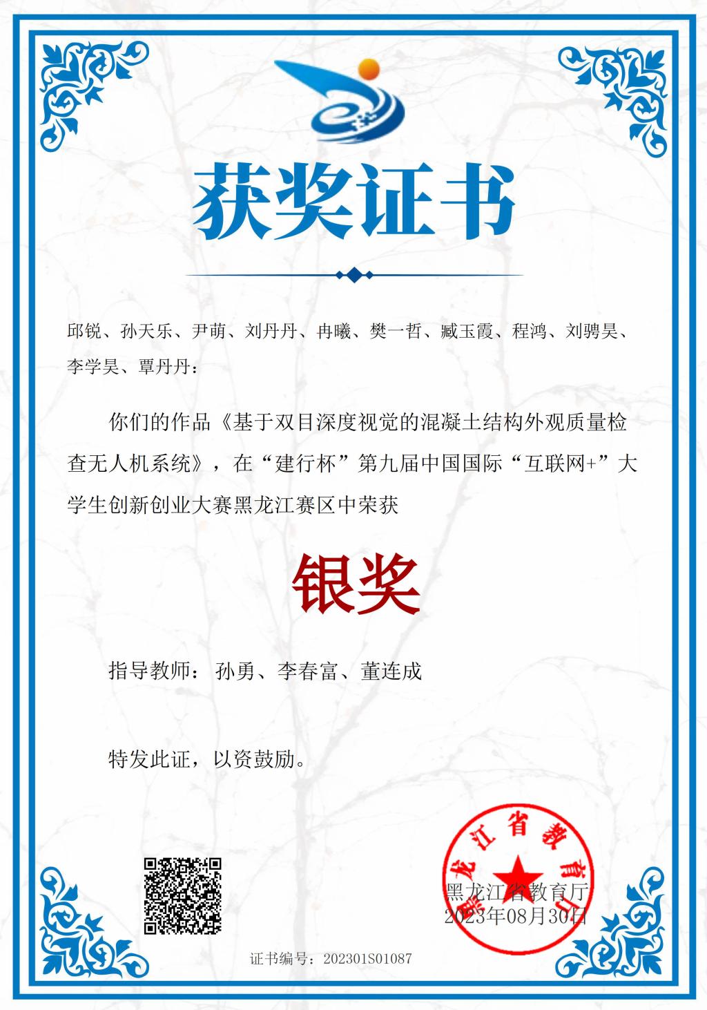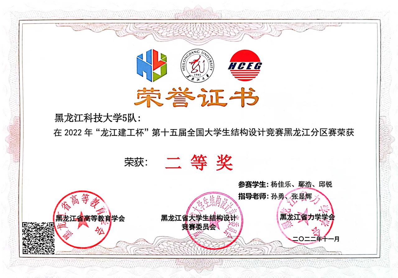 本专业重视依托学科竞赛的学生综合素质培养,为100%的学生提供参加桥梁设计、道路设计、BIM建模等国、省、校各级竞赛和参与科研立项的机会,建成校级大学生创新创业基地2处、校级创新人才工作室2处。近三年来教师指导学生获得国家级竞赛奖项20余项、省级与校级竞赛奖项百余项。在2023年中国国际“互联网+”大学生创新创业大赛黑龙江省赛区获银奖1项、铜奖1项;在2023年全国先进成图技术与产品信息建模大赛-建筑类先进成图技术赛道获得国家二等奖1项,三等奖2项;在2022年全国土木工程优秀作品征集大赛获三等奖,且为黑龙江省高校桥梁专业本科组唯一获奖队伍;获2022年全国大学生结构设计竞赛黑龙江省分赛二等奖;获得多届黑龙江省高校“龙建杯”大学生创新创业系列大赛奖项,如立交桥模型设计制作大赛特等奖、建筑BIM应用技能大赛设计及绿色建筑分析一等奖、建筑BIM应用技能大赛全能一等奖、第八届TRCC全国机器人创意设计大赛机器人创意表演一等奖、BIM算量与管理专项二等奖、轻质高强混凝土设计大赛二等奖、BIM设计与绿色建筑分析专项二等奖等。