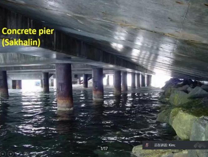 Kim教授的报告分别从混凝土劣化类型、海上混凝土平台冰磨损、实验室与现场实测数据处理、混凝土综合劣化分析模型、劣化过程仿真模型,以及混凝土结构使用寿命评估等六个方面展开。以“库页岛I号”、“库页岛II”号海上工程为背景,详细探讨了氯化物侵蚀、盐溶液运输、冻融循环等环境作用下混凝土结构的劣化特征与评估方法,还针对多种损伤耦合导致混凝土结构退化加速,以及结构使用寿命预测等问题进行了重点介绍。在互动环节中,taptap竞彩足球教师Kim教授进行了沟通交流,在混凝土耐久性试验验证方法等方面开展了深入探讨。
