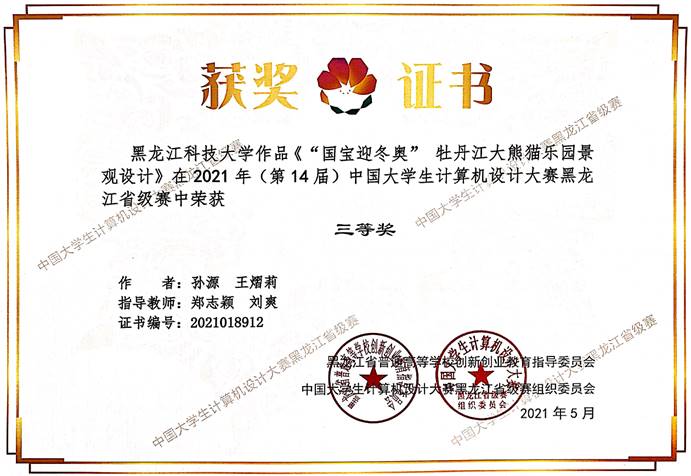 近日,2021年第十四届中国大学生计算机设计大赛黑龙江省赛落下帷幕。经过多日角逐,由taptap竞彩足球郑志颖、刘爽老师指导的风景园林专业2018级学生孙源、王熠莉完成的作品《“国宝迎冬奥”牡丹江大熊猫乐园景观设计》,荣获本次计算机设计大赛数媒静态设计专业组三等奖。