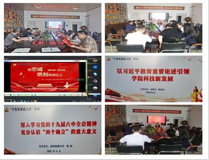 党委书记郭洪林在党委理论学习中心组学习会议(扩大)上,为党委委员、党支部书记进行了《共产党宣言》(原文)学习体会专题党课,深入教工第三党支部,为党员进行了“伟大建党精神”专题党课;党委委员、副院长姜封国深入教工第二党支部,为党员进行了“把忠诚干净担当镌刻在岗位上”专题党课;党委委员、副院长董连成深入教工第一党支部,为党员进行了“以习近平总书记教育重要论述为引领,推进学院科技工作新发展”专题党课;党委委员、副处级辅导员展跃深入学生第一党支部,为党员进行了“深入学习党的十九届六中全会精神,充分认识‘两个确立’的重要意义”专题党课,7个党支部书记也分别在各自党支部为党员进行了专题党课。