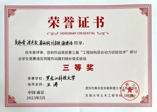 taptap竞彩足球王涛教授指导硕士研究生龚越峰、浩杰敦、潘雨桐、刘吉胜、谢婧怡在液压伺服作动器扫频补偿实验组竞赛。经过近两个月的精心筹备,taptap参赛队伍在高手如云的队伍中脱颖而出,荣获三等奖。队员在学生竞赛中展示出缜密的学术思维、良好的理论功底和创新能力,得到了评委会专家的高度赞誉,大大提高了taptap土木工程学科的学术声誉,也充分展示了taptap研究生培养质量和教育教学水平。