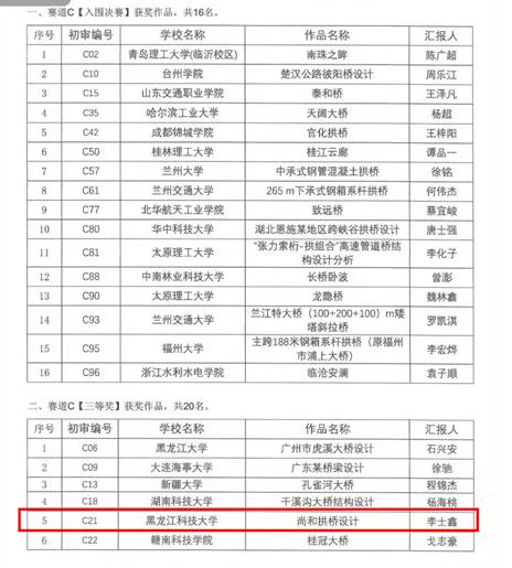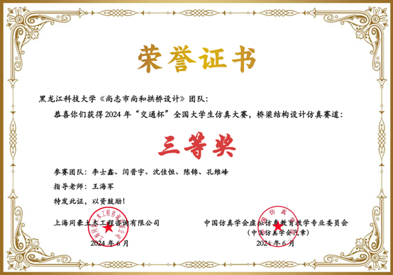 近日,在第四届全国高校土木工程创新设计大赛、“交通杯”全国大学生仿真大赛等两项具有较大行业影响力的学科竞赛中,由孙勇老师、孙大珩老师指导的“巩乃斯大桥施工控制方案设计”获得了全国二等奖;由王海军老师指导的“尚志市尚和拱桥设计”获得了全国三等奖的好成绩。
