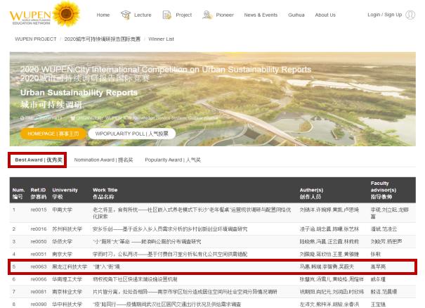 本次竞赛全部以线上方式进行。共有同济大学、清华大学、北京大学等几十所一流高校均参与了竞赛角逐,部分国外院校也参与了这一盛事。历经3个月评审工作,最终有335份作品进入专家评审,共评出优秀奖23份,提名奖199份。taptap城乡规划专业学生在本次竞赛中表现优异,共获优秀奖1项、提名奖4项。获奖情况在黑龙江参赛高校中名列第二名,再创taptap城乡规划专业参加该类竞赛的优异成绩。