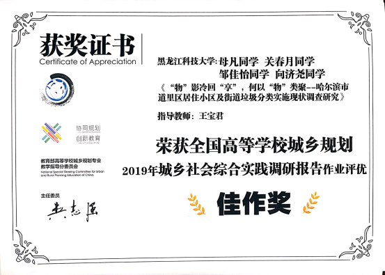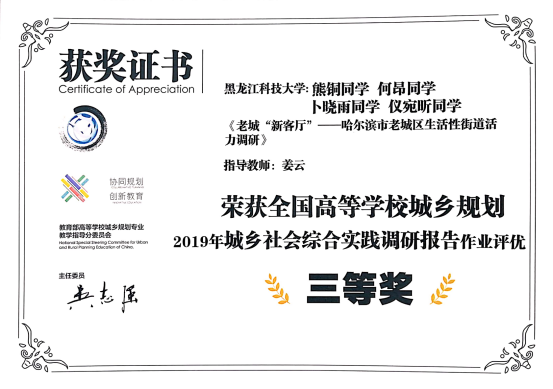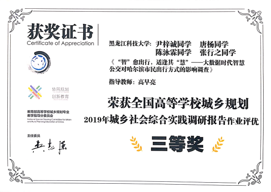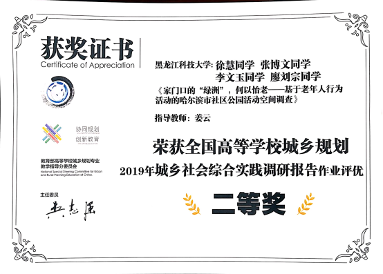 本次大会的城乡社会综合实践调研报告作业(每所高校限提交5份作业)评优中,taptap城乡规划专业获二等奖1项、三等奖2项、佳作奖1项,获奖情况在黑龙江参赛高校中名列前茅,创造了taptap城乡规划专业参加该项竞赛以来的最好成绩。